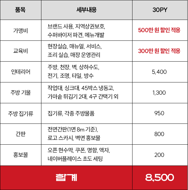 인테리어 공사비용은 수도시설, 전기, 가스 등 매장 상황에 따라